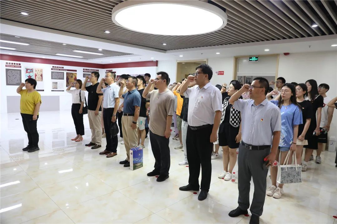 “我志愿加入中国共产党,拥护党的纲领,遵守党的章程,履行党员义务,执行党的决定……””全体党员在誓词教育厅前,面对鲜红党旗,举起右拳,庄严宣誓。声音洪亮有力,深切表达了对党的无限忠诚。