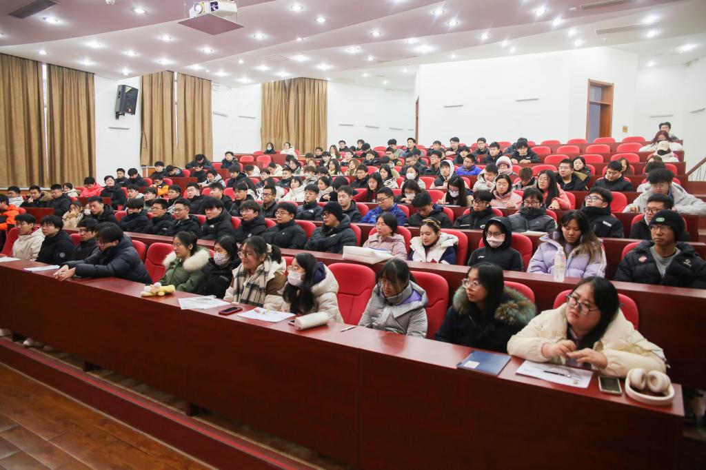 12月26日,yl8cc永利官网教师吕昊博士(后)和邵唐砂博士在西校园八角楼为2021级全体本科生作职业生涯规划经验分享,辅导员李炳树主持会议。