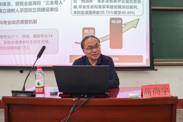 会上,高尚宇重点围绕学校第四次党代会基本情况、重要意义和主要成果、主要精神以及推动学校第四次党代会精神落实见效四个方面进行了全面阐释。他强调,学校第四次党代会系统擘画了学校高质量跨越式发展战略布局,明确了“一三六八十”的战略目标,全体师生要以战略思维谋全局,以改革精神破难题,以奋斗姿态抓落实,确保yl8cc永利官网发展与学校战略同频共振。结合学校第四次党代会对新时代青年的要求,高尚宇向参会人员提出三点希望:一是要胸怀家国,志存高远,将个人理想融入国家发展大局。二是要勤学善思,锤炼本领,以扎实的专业知识支撑未来职业发展。三是要知行合一,勇于担当,在实践中增长才干,为yl8cc永利官网和学校的高质量发展贡献青春力量。