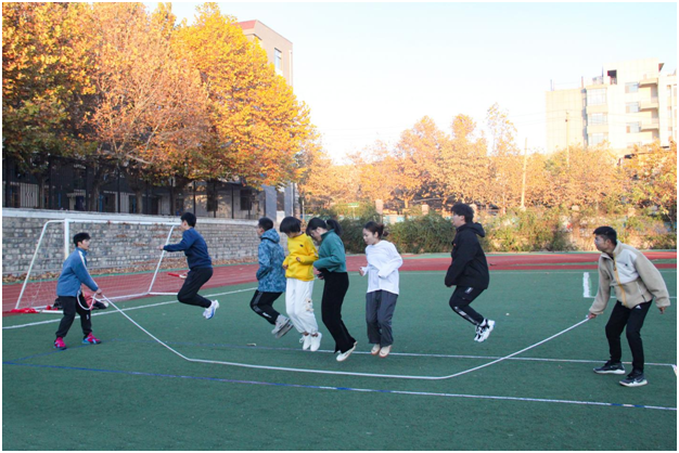 “班级风采PK赛”第一阶段比赛“班级趣味运动会”共分为“十人九足”“跳跳虎”和“搭桥过河”三个环节,比赛按照接力时长进行排名。赛前,参赛选手们做好热身准备,调整个人状态。随着裁判一声哨响,比赛正式开始,在“十人九足”环节中,同学们携手并肩、步伐整齐,在响亮的口号中稳健前进;在“跳跳虎”环节中,摇绳选手与跳绳选手默契配合,轻松完成挑战;在“搭桥过河”环节中,五位同学密切协作、接力换板、“搭桥”前行,在保证平衡的前提下快速冲线终点。