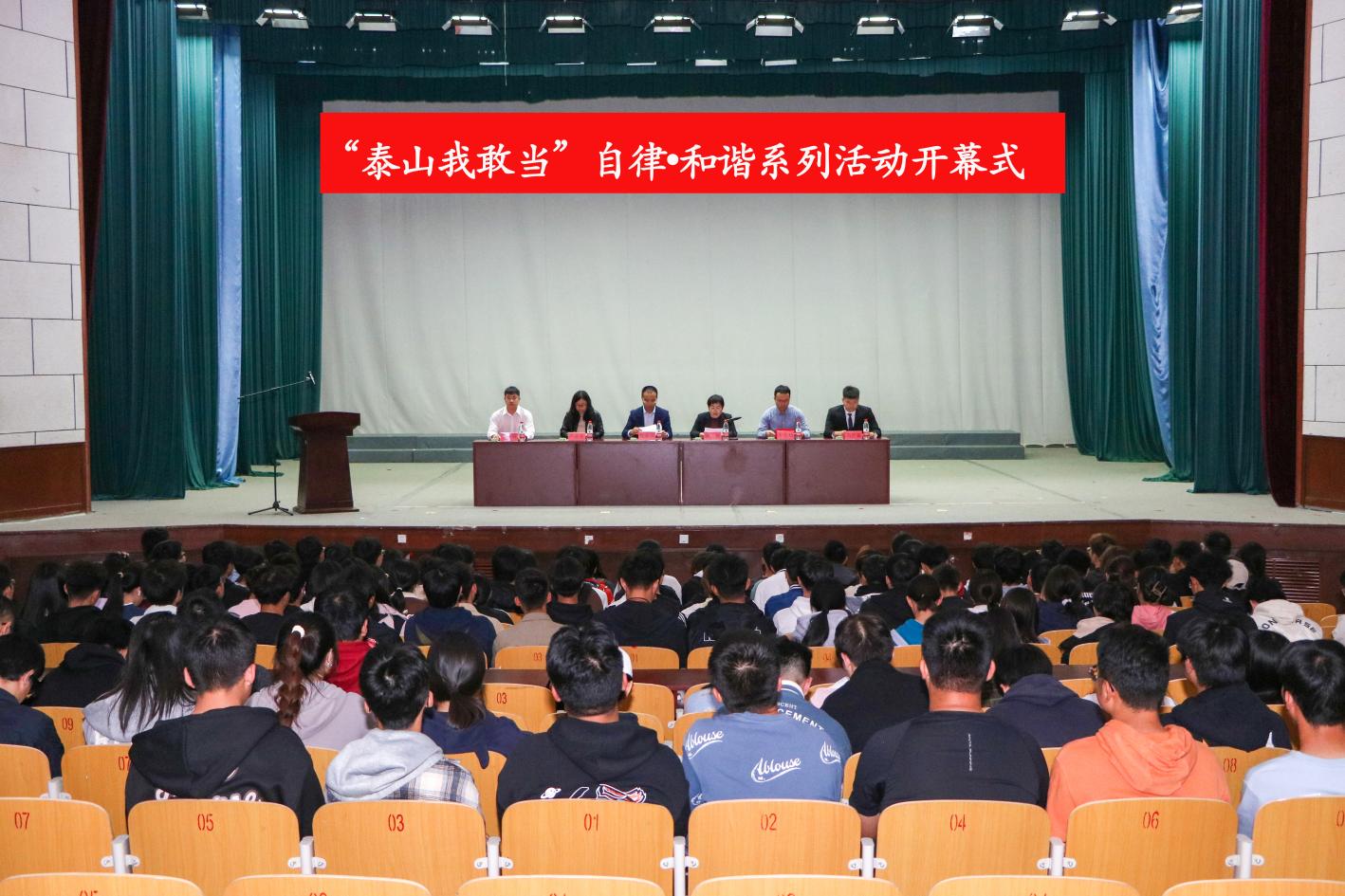 10月25日,yl8cc永利官网第八届“泰山我敢当”大员工自律•和谐系列活动开幕式在西校园礼堂举行。yl8cc永利官网党委副书记、副院长程家国,团委辅导员老师及2023级全体员工参加开幕式。