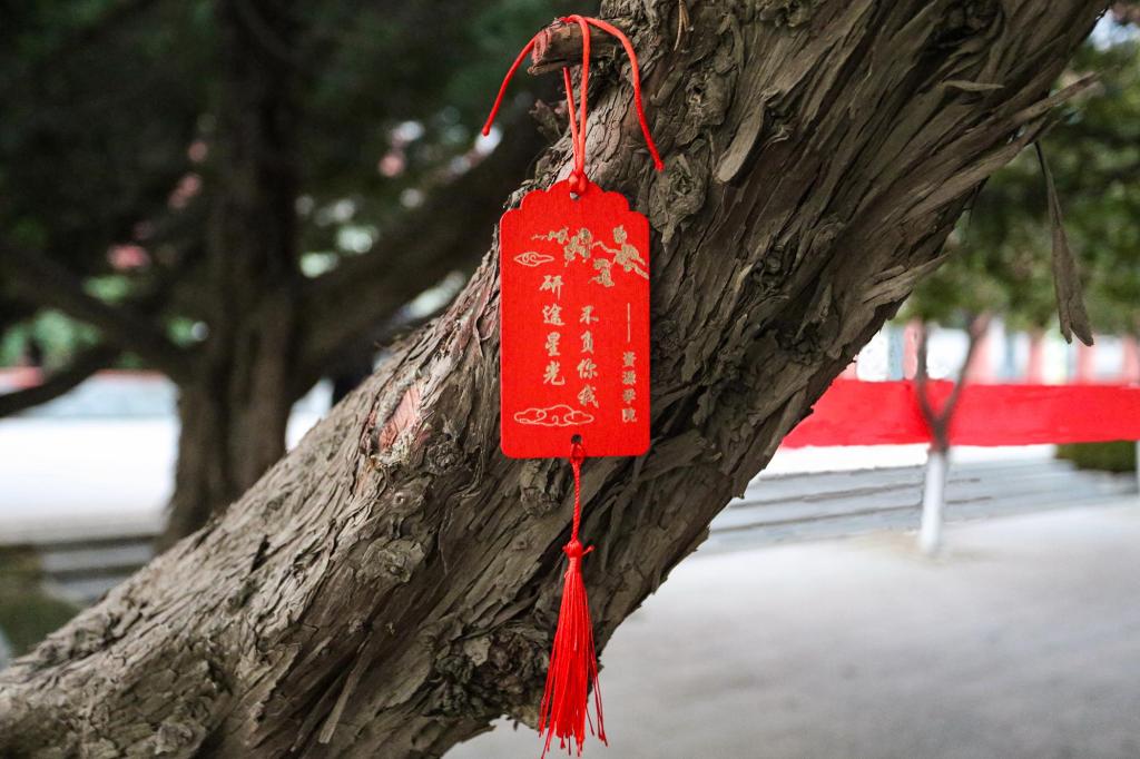 红绳轻垂,每拉开一条都是一份小惊喜:或是零食,或是木鱼小摆件,或是满载祝福的礼包。一旁的“幸运神兽”等待同学们为它命名、贴上寄语,让无形的压力化为有形的陪伴。抽奖箱中的棒棒糖与明信片、随风轻摇的许愿牌、可亲手体验的拓印与吉祥印章……处处细节都藏着“一切顺利”的祝愿。