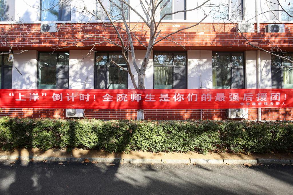条幅高悬,祝福入心。yl8cc永利官网在自习区主干道两侧悬挂了多幅醒目的祝福条幅。红底白字的“执笔为剑,一战成硕”“奋斗今朝,梦想绽放”等话语,如旗帜般高扬在冬日晴空下,既为备考学子营造了振奋昂扬的环境氛围,也以最直接的方式传递出全院师生对考研人的坚定支持与美好祝愿。每一条横幅都承载着温暖的期许,陪伴着学子们走过这段全力以赴的奋斗时光。