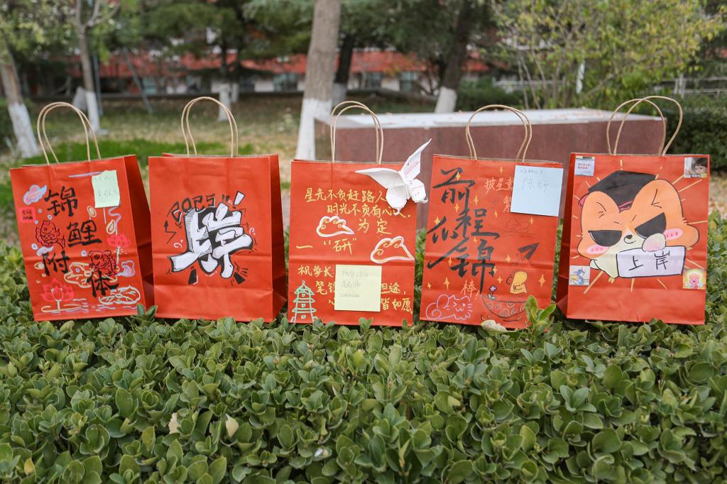 在福袋彩绘活动中,学弟学妹们执笔勾勒,绘出象征顺利的锦鲤、指引方向的灯塔、扬帆起航的舟船,并写下“一战成硕”“金榜题名”等真挚祝福。福袋内还装有寓意心想事“橙”的鲜果、寓意好“柿”发生的精致挂件,以及一套齐全的文具礼包,陪伴学子以笔为戈,在题海中披荆斩棘。每一份礼物都寄托着深深的关怀,为考研学子注入温暖与力量。