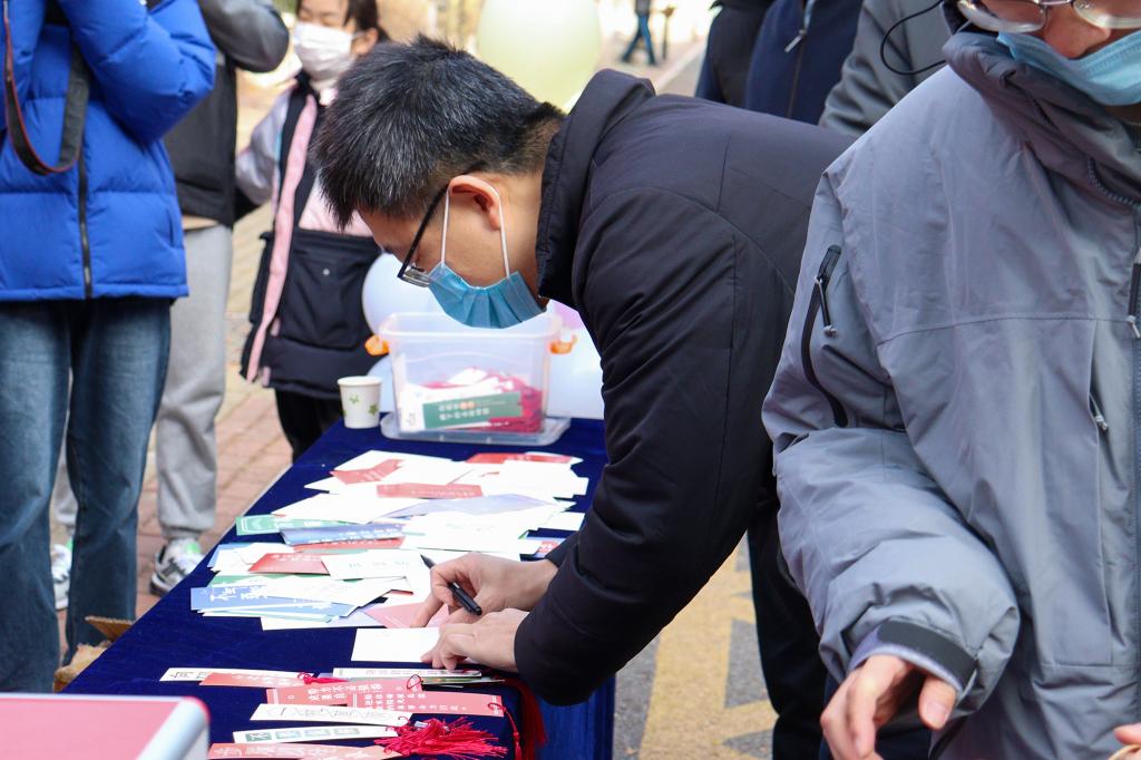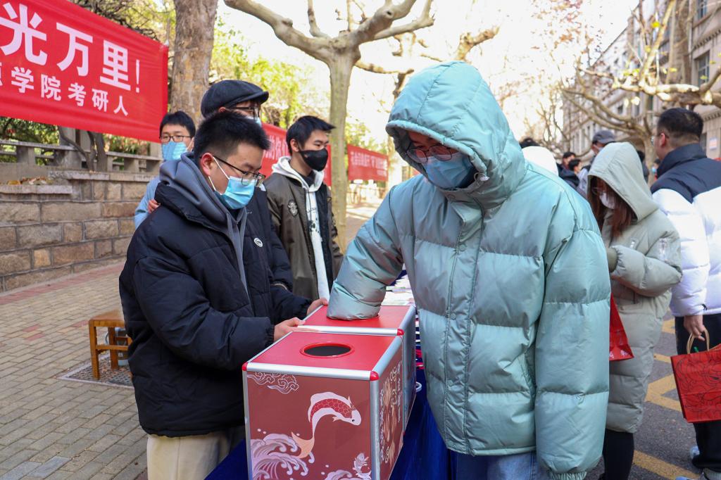 “守得云开见月明,祝学长学姐一战成硕,成功上岸!”“前路浩浩荡荡,万物皆可期”“乾坤未定,你我皆是黑马”......“‘研’途助力”盲盒中的一张张明信片上书写的不仅是文字,更承载着学弟学妹们对考研学子的真挚祝福;“生活很苦,自己加糖,路上会遇天黑,但抬头就能看到阳光”,“研途‘甜’翼”盲盒中的棒棒糖,将甜味沁入心脾,寓意苦尽甘来,抚慰着考研学子的焦灼内心。