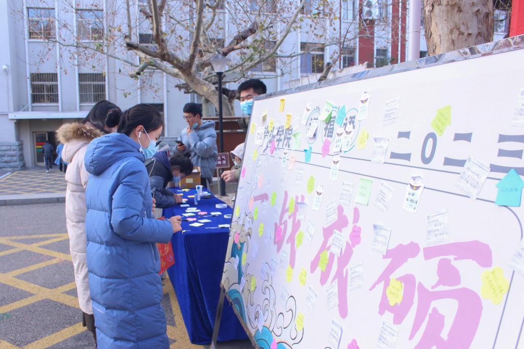展板上,学弟学妹们写满了对考研学长学姐们的祝福与鼓励。“硕果在前,只管去摘”“祝学姐学长们成功上岸!”“考研加油,万事胜意!”……便利贴上可爱的手绘卡通人物、一字一句写下的暖心祝语驱散了冬日的寒冷,让考研学子们倍感温暖与感动。