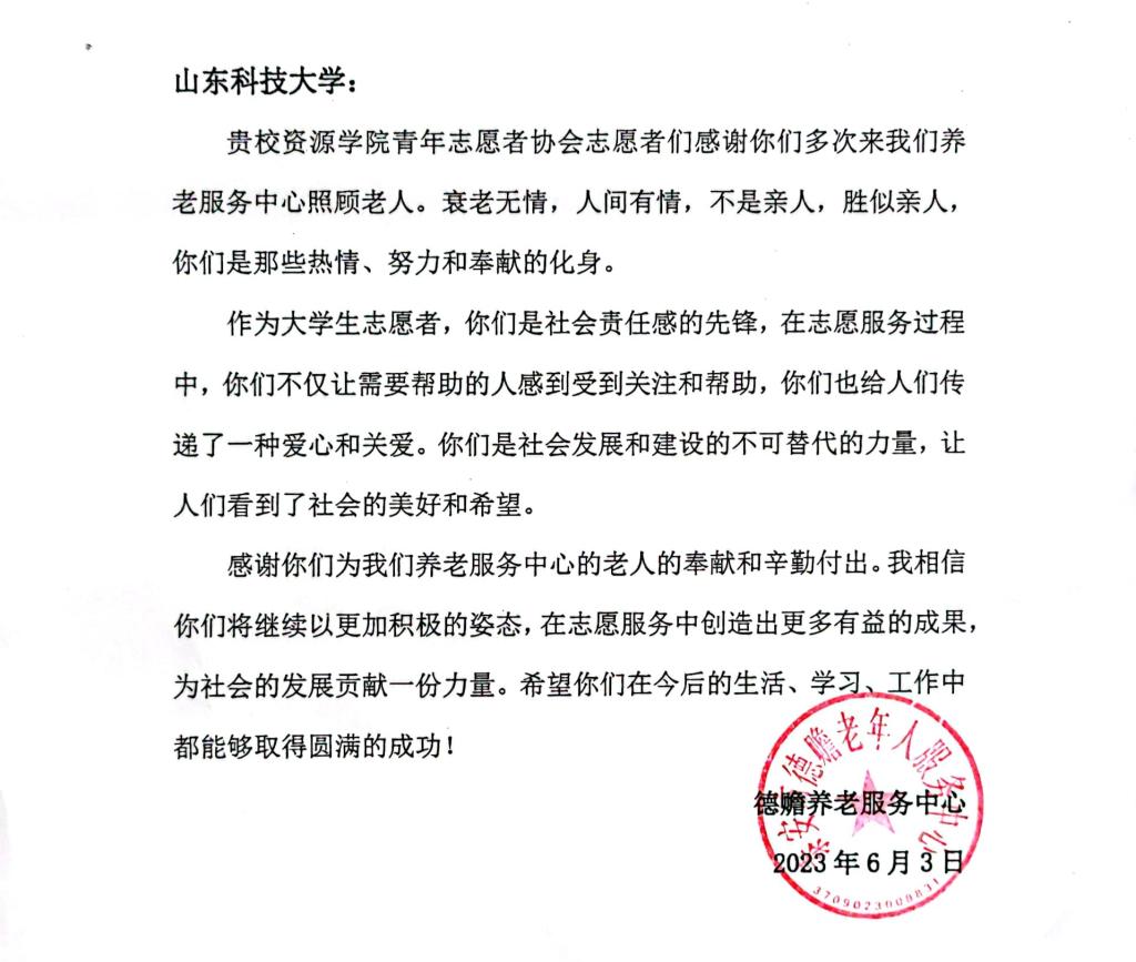 活动后,yl8cc永利官网收到德赡养老服务中心感谢信。志愿者们深受鼓舞,纷纷表示将进一步弘扬志愿服务精神,持续开展好校内外志愿服务活动,丰富活动载体,创新活动形式,让“奉献、友爱、互助、进步”的志愿服务精神在yl8cc永利官网蔚然成风。(yl8cc永利官网供稿)
